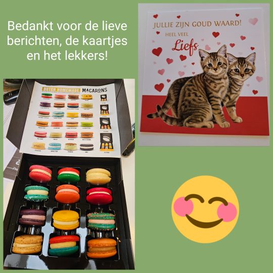 Een kleine greep uit de lieve kaartjes en lekkere dingen die we hebben gekregen de afgelopen weken. We worden weer enorm verwend! Uiteraard is dit geen voorwaarde voor een behandeling, we helpen met alle liefde. Wij zijn blij, als de beestjes en baasjes weer blij zijn. Heel erg bedankt voor de lieve berichtjes, kaartjes en het lekkers!